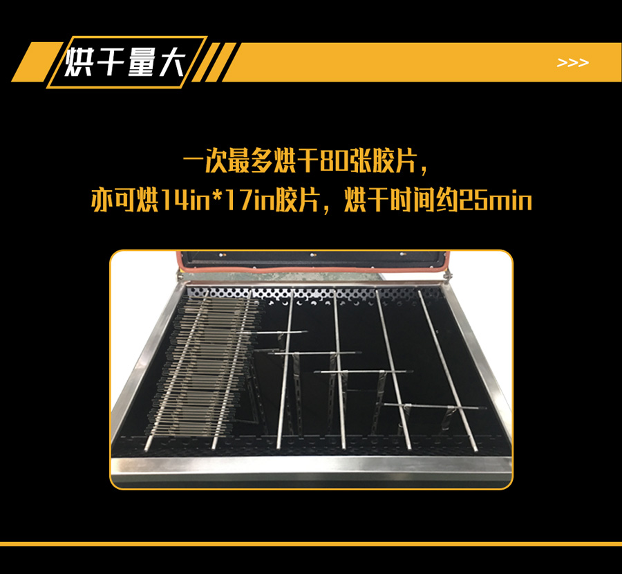 1、一次能烘干80張常規(guī)膠片,亦可烘14in*17in膠片,烘干時(shí)間約25min;