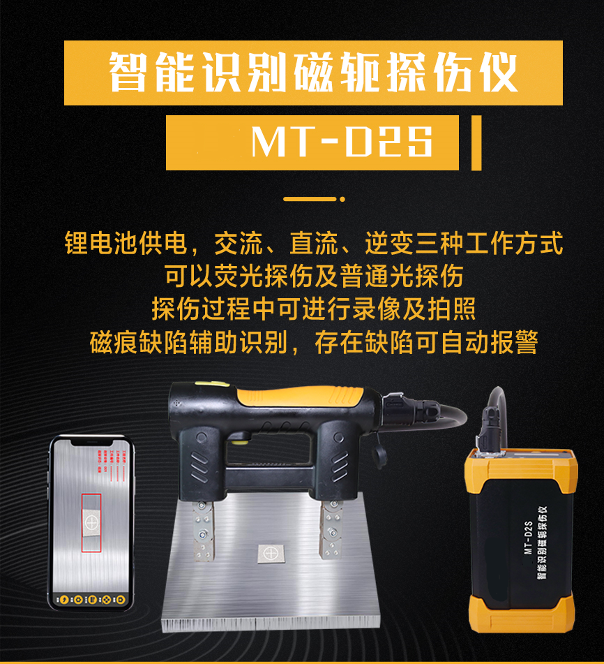 1、MT-D2S智能識(shí)別磁軛探傷儀,為便攜式設(shè)計(jì),無需外接220V電源,即可產(chǎn)生交流或直流磁場(chǎng);