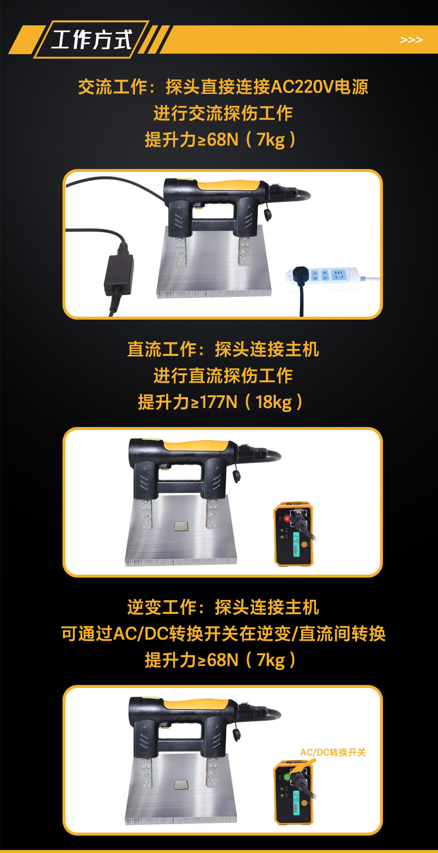 (1)交流工作:探頭直接連接AC220V電源進(jìn)行交流探傷;