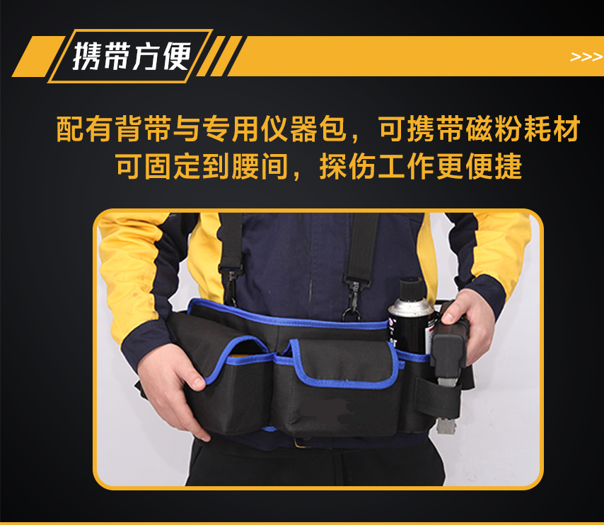 6、配有背帶與專用儀器腰包,可攜帶主機(jī)、探頭及磁粉耗材,可固定到腰間,方便在工件探傷時(shí)使用;