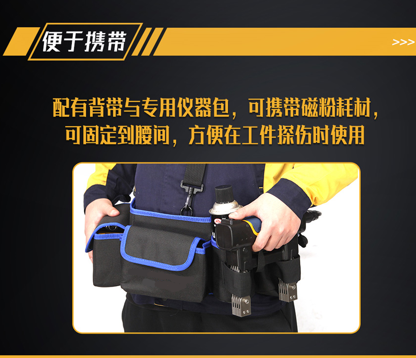 8、配有背帶與專用儀器腰包,可攜帶主機(jī)、探頭及磁粉耗材,可固定到腰間,方便在工件探傷時(shí)使用;