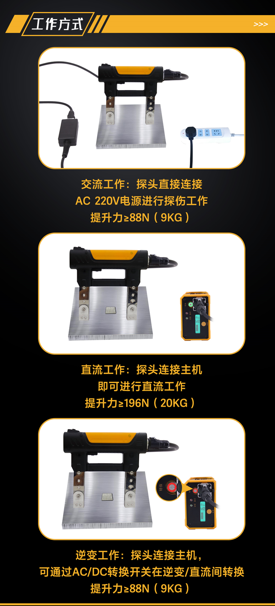 (1)交流工作:探頭直接連接AC220V電源可進(jìn)行交流探傷;