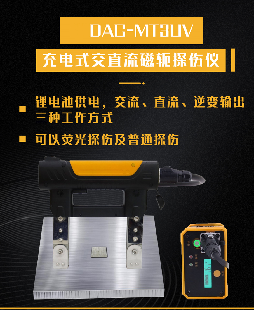 1、DAC-MT3UV充電式交直流磁軛探傷儀,為便攜式設(shè)計(jì),無需外接220V電源,即可產(chǎn)生交流或直流磁場(chǎng),配有兩組快捷拆換鋰電池,一用一備續(xù)航時(shí)間更長(zhǎng);