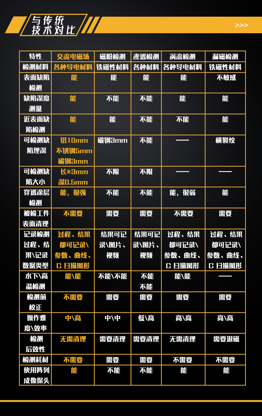 1、交流電磁場檢測技術適用各種導電體材料,主要用于鐵磁性或非鐵磁性材料對于表面或近表面的缺陷可以快速準確的檢出;