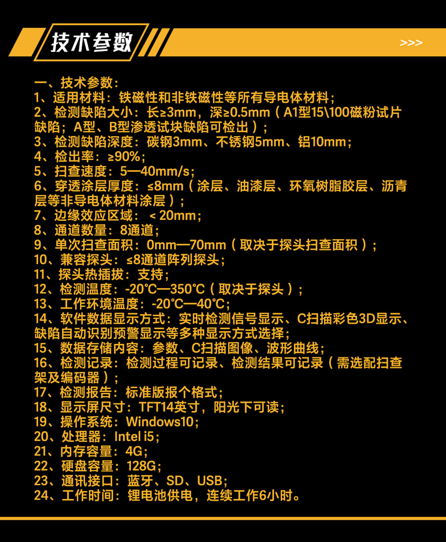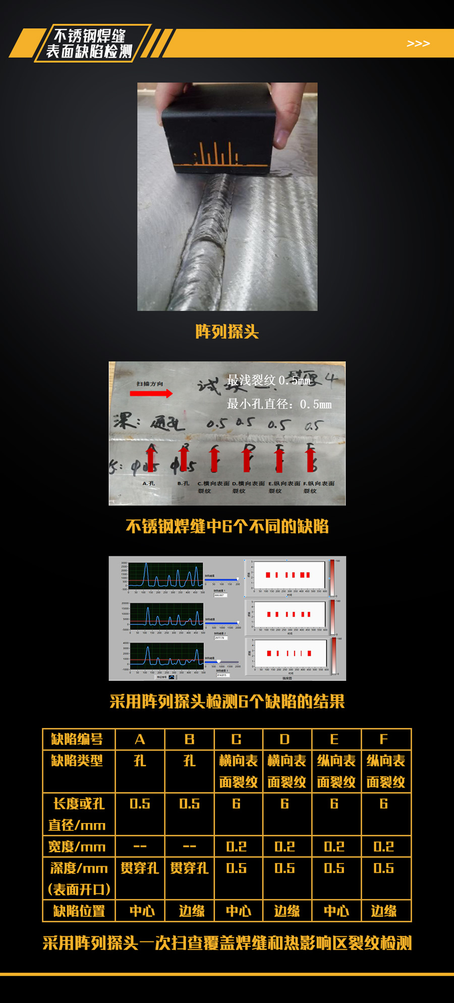 3、檢測(cè)缺陷深度:碳鋼3mm、不銹鋼5mm、鋁10mm;